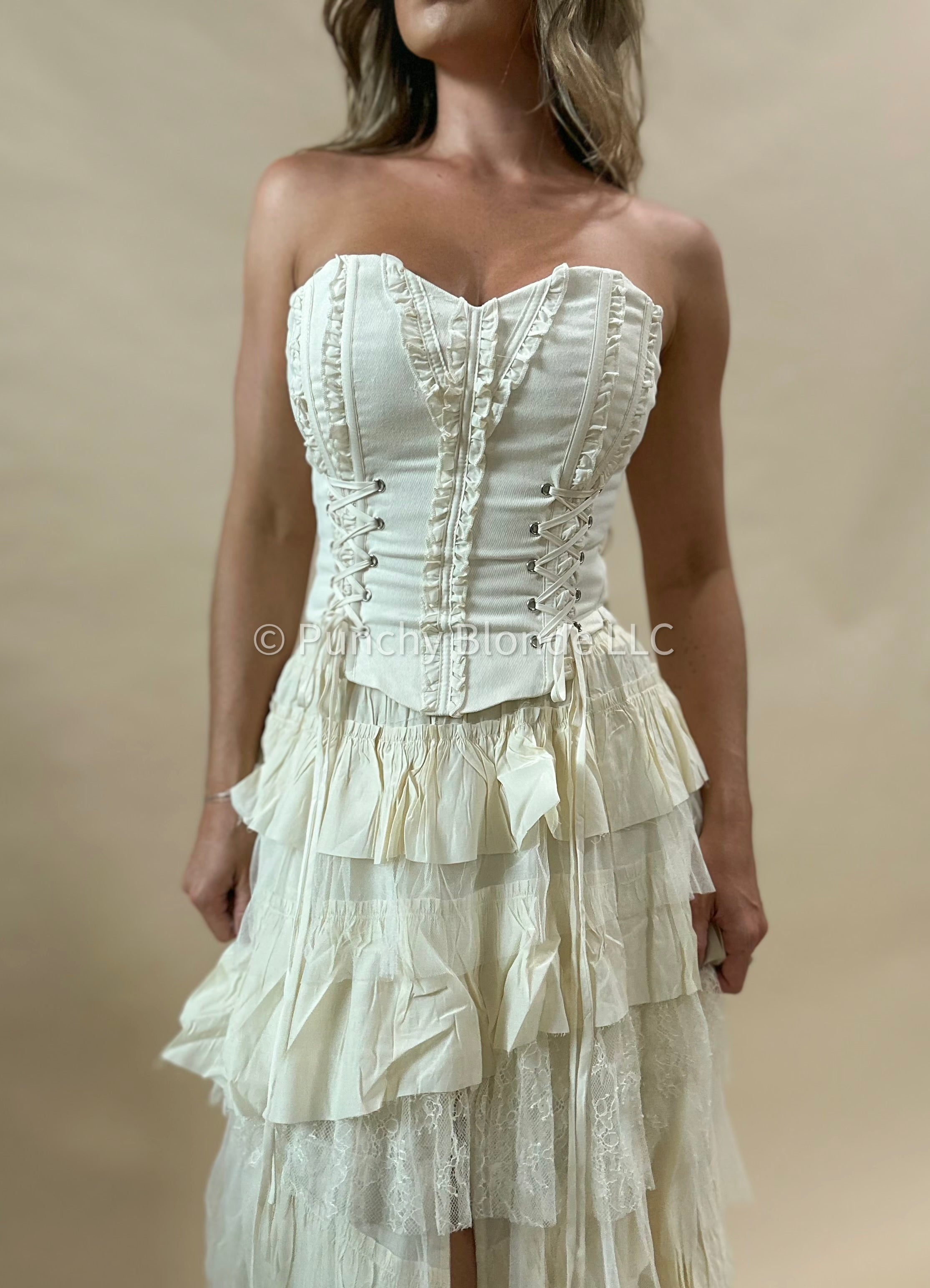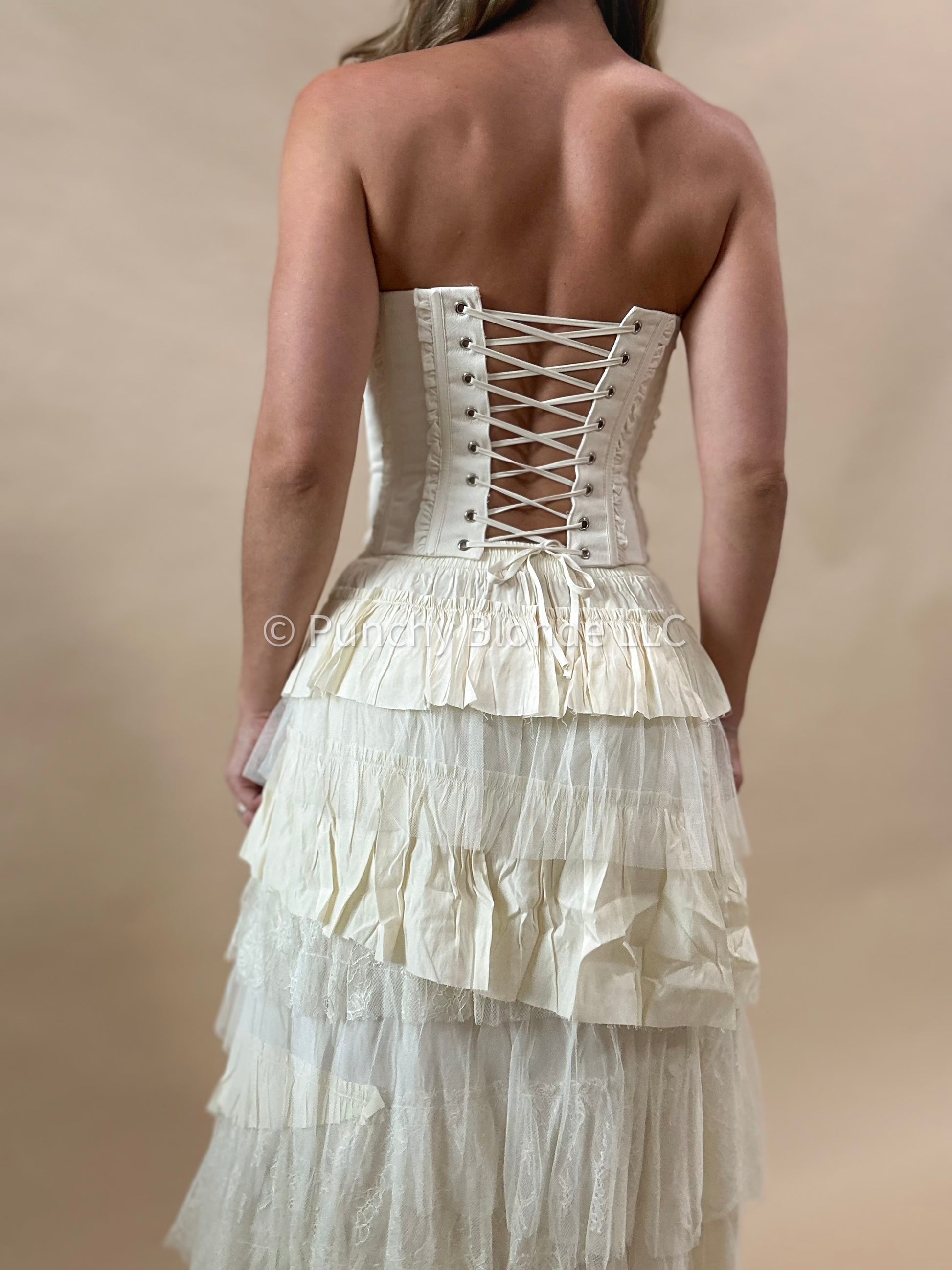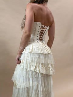 Rigid ruffle design, self tie corset back, lined