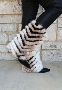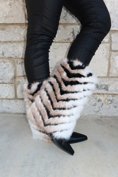 Black and white faux fur bootie with a sleek pointed toe and sturdy wedge block heel, a playful pop of texture and color.