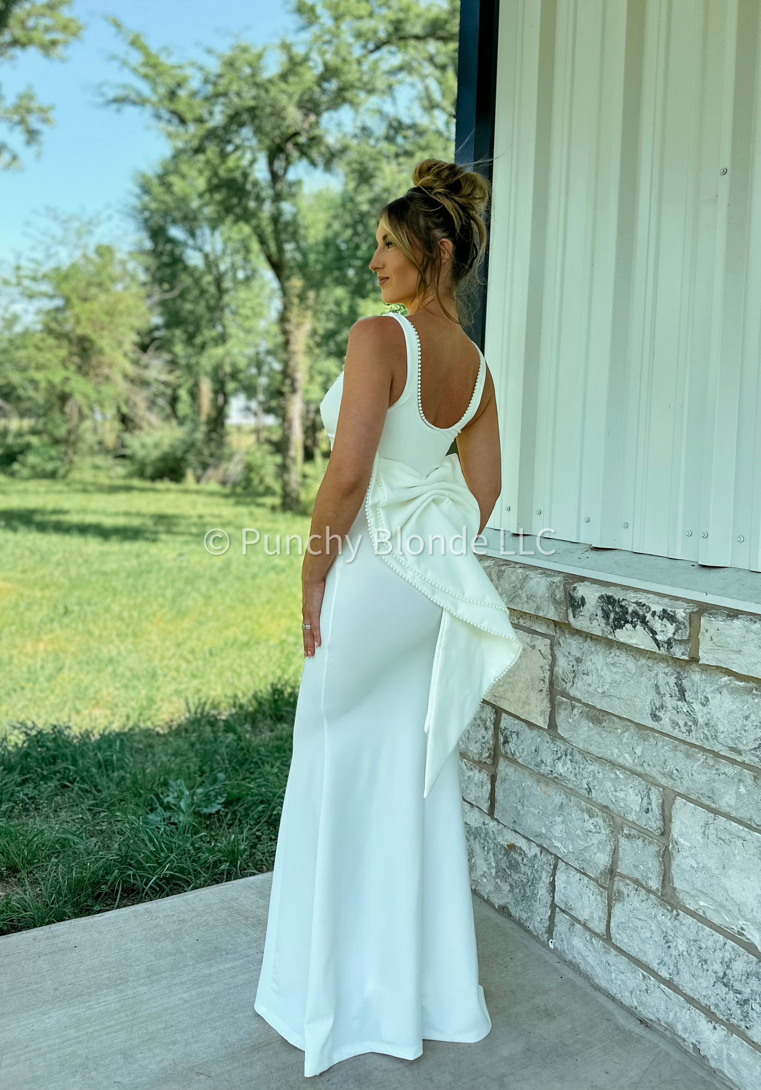 Square neckline, pearl trim, stretchy material, mermaid maxi