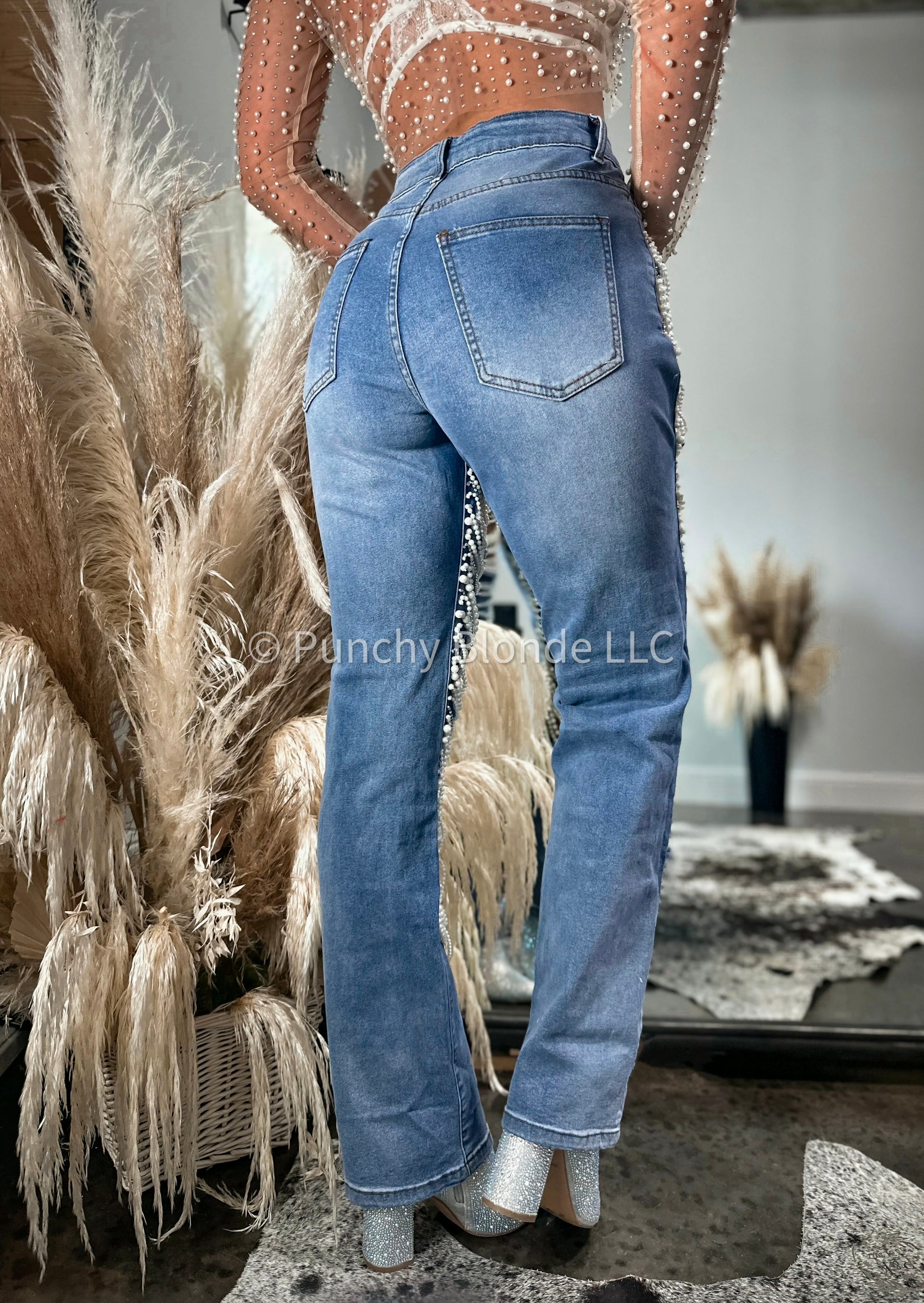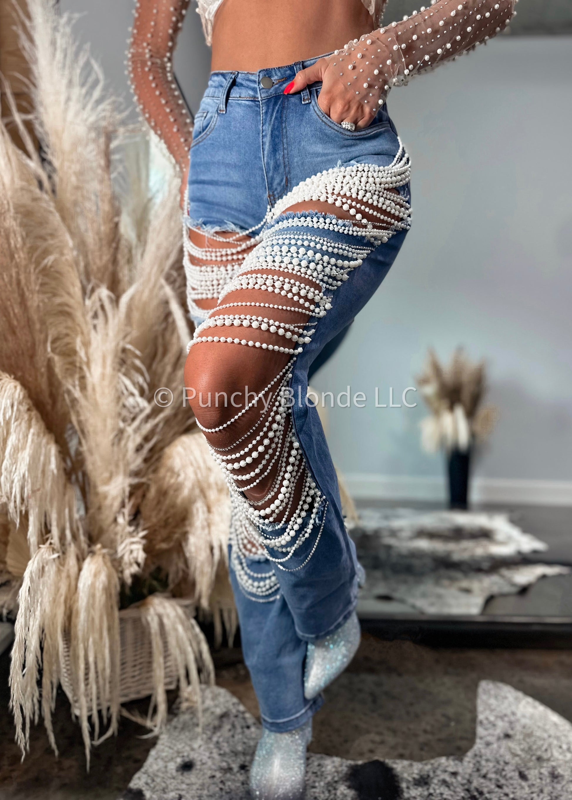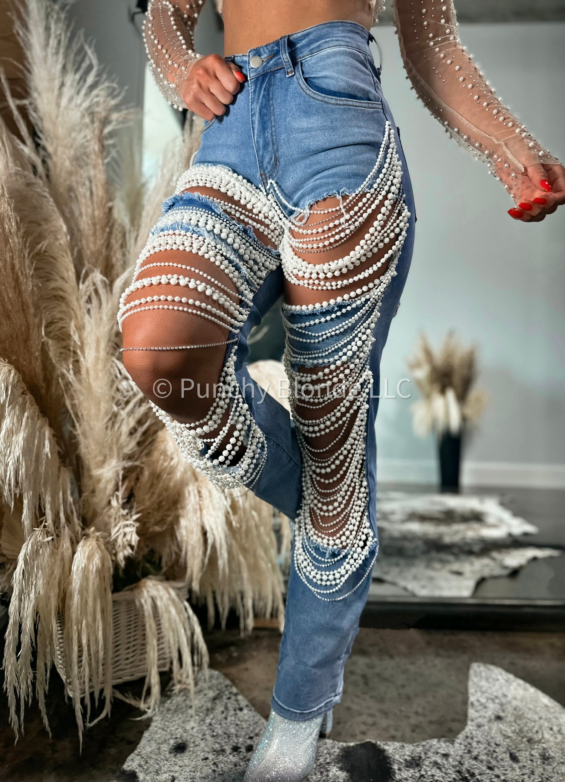Perlas en capas y hebras de diamantes de imitación cosidas en los jeans.