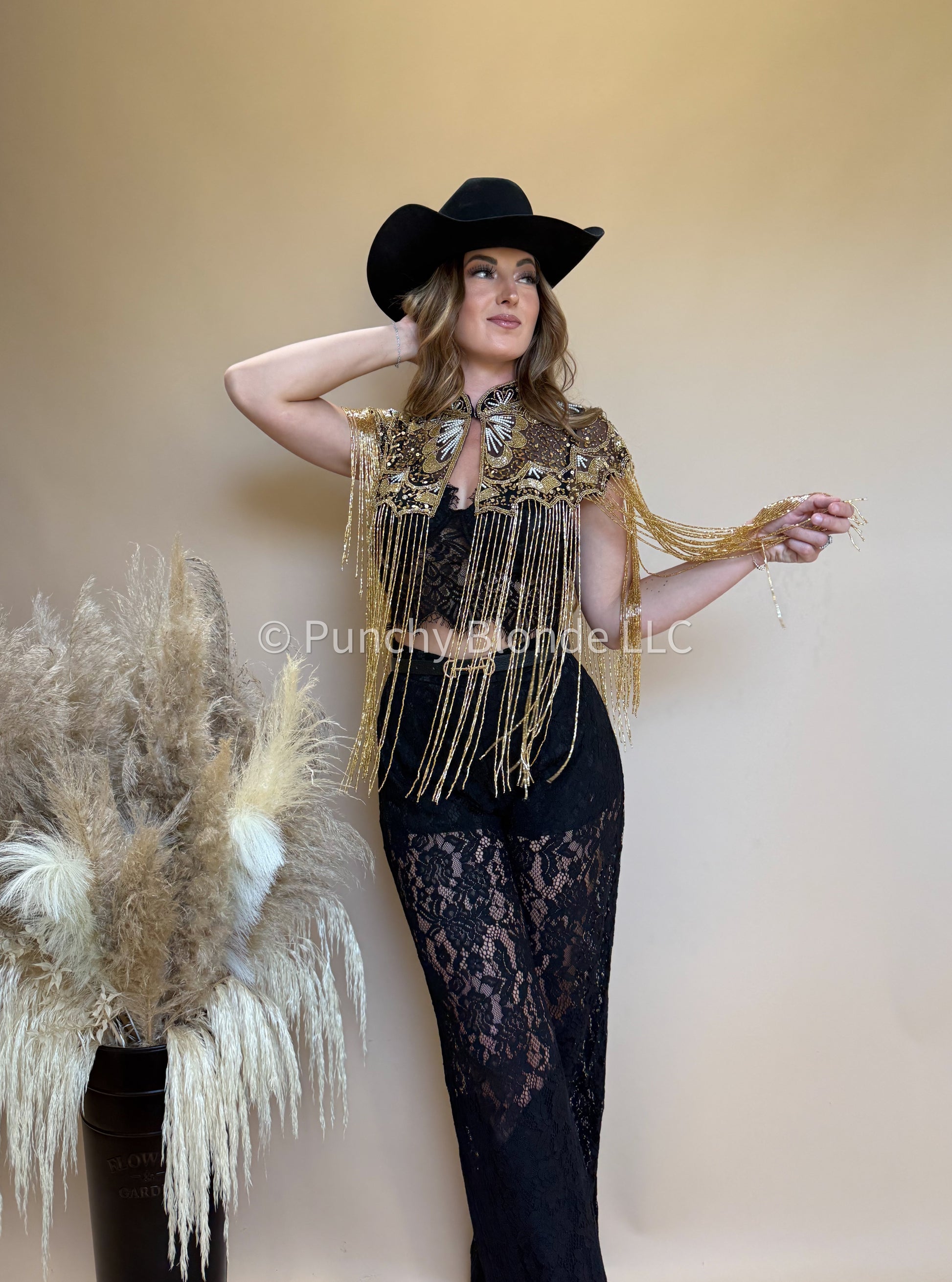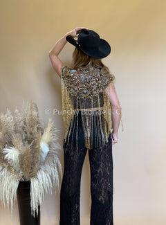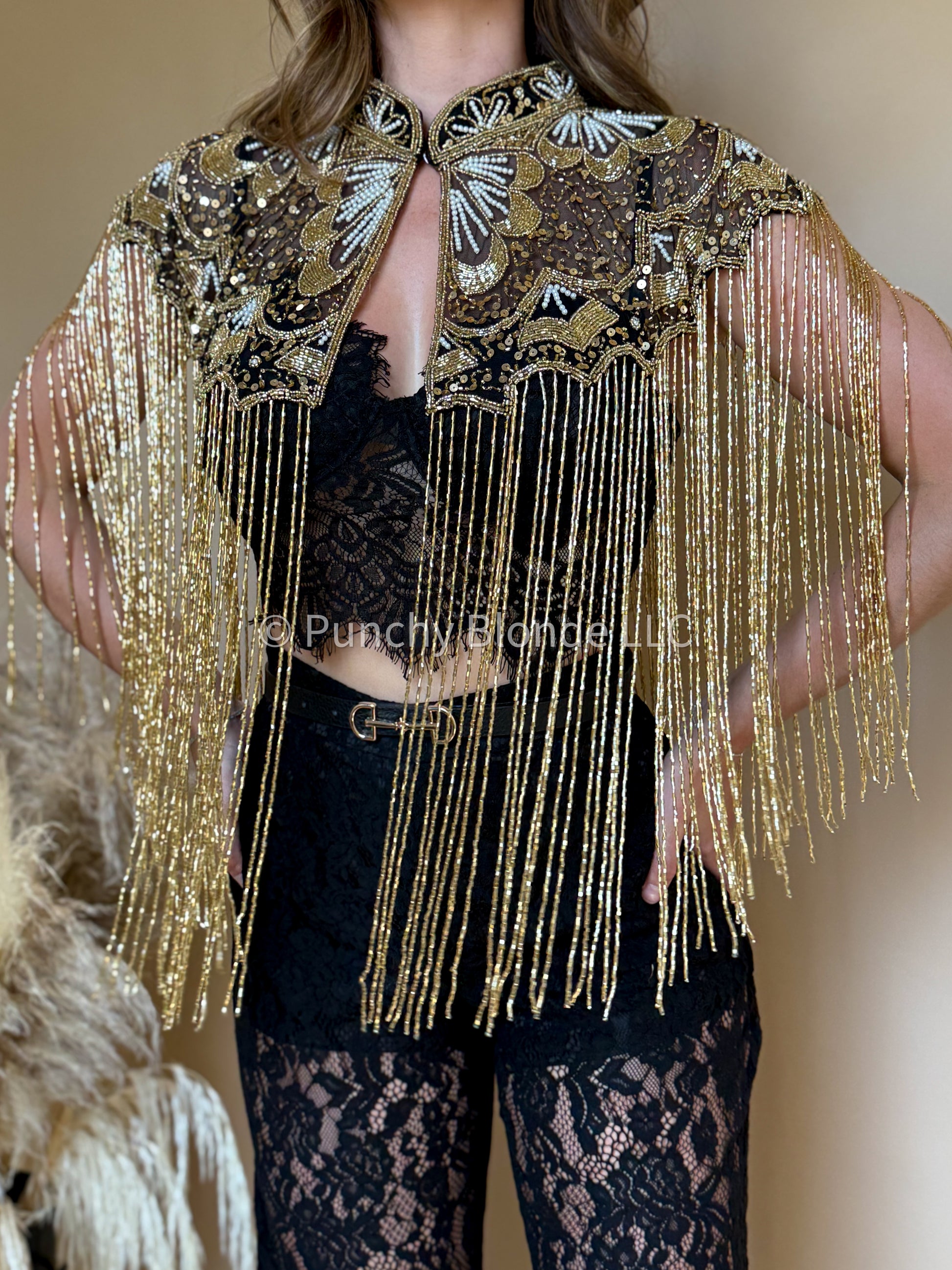 Delicate gold beaded fringe, gold sequins throughout