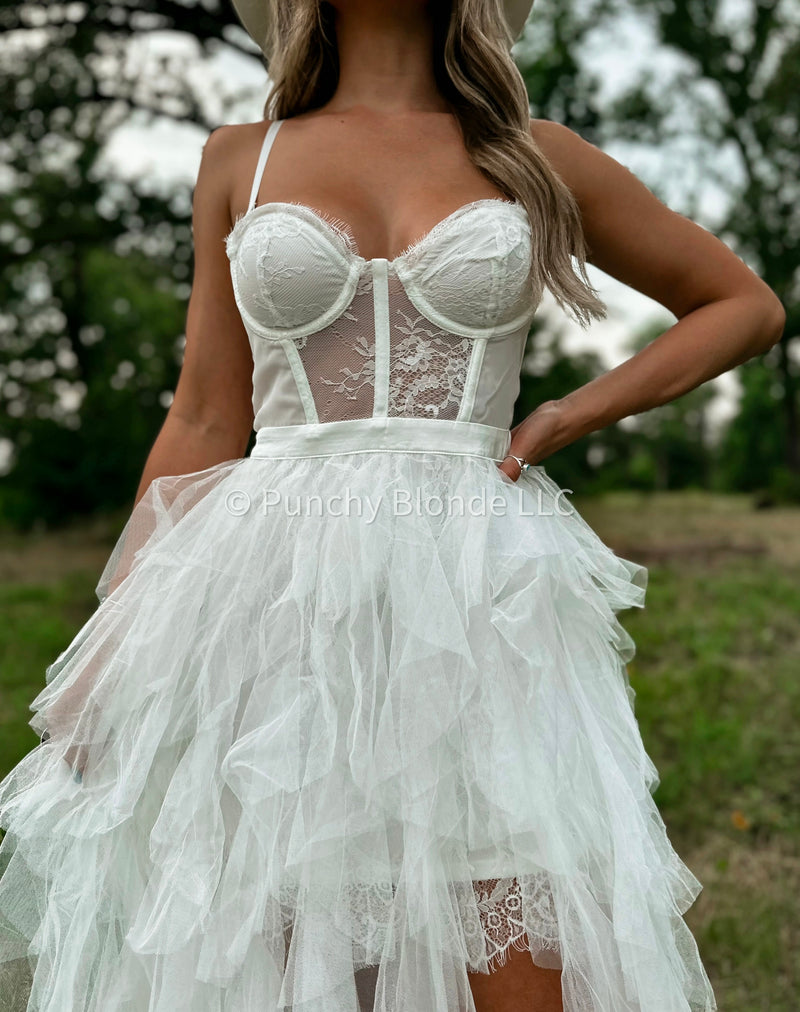 Abertura en la pierna izquierda, falda forrada, corpiño de encaje