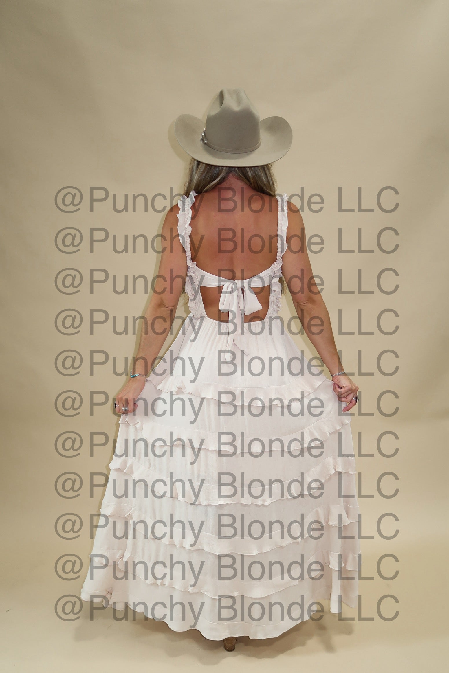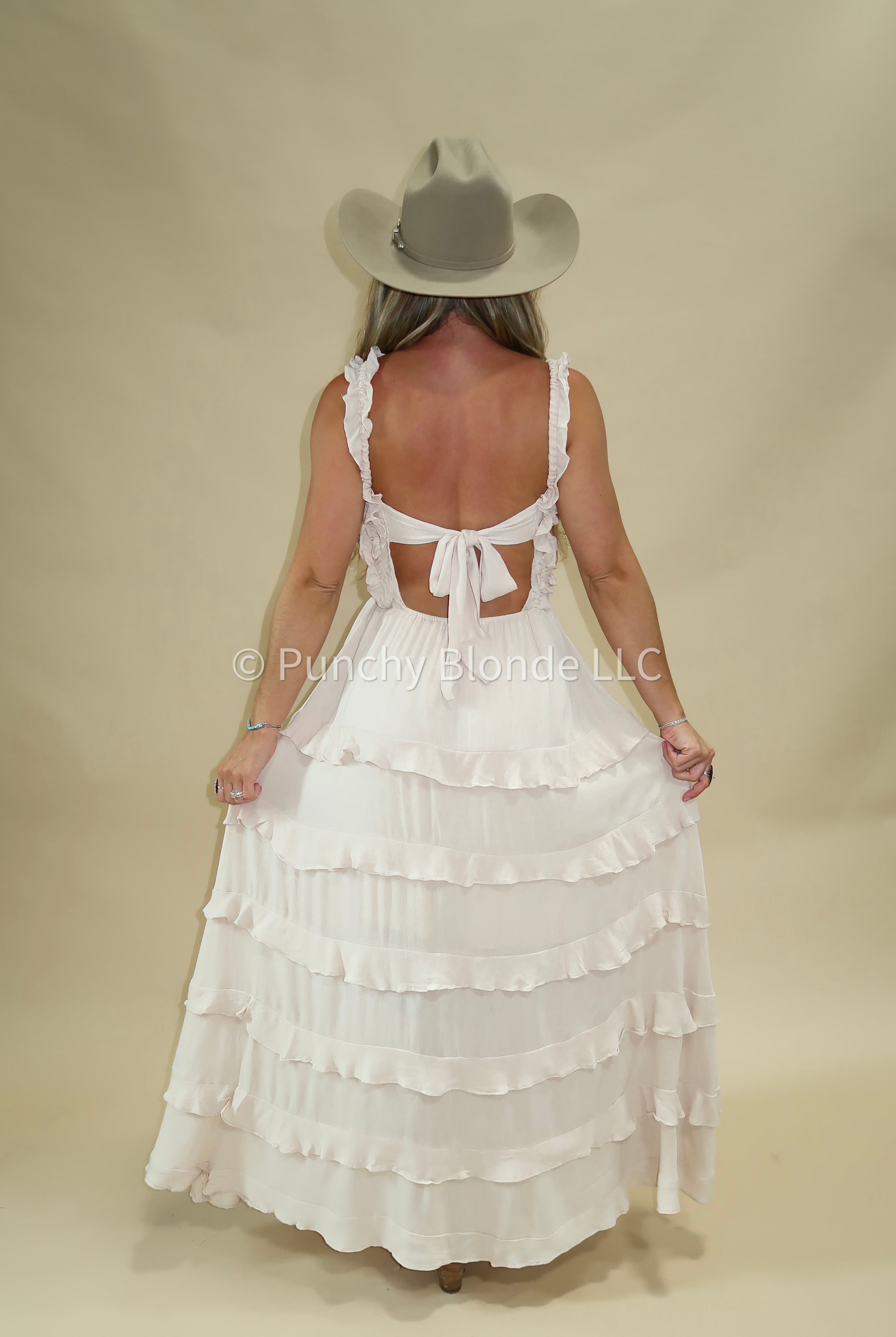 open back, self tie straps, tiered maxi, lined