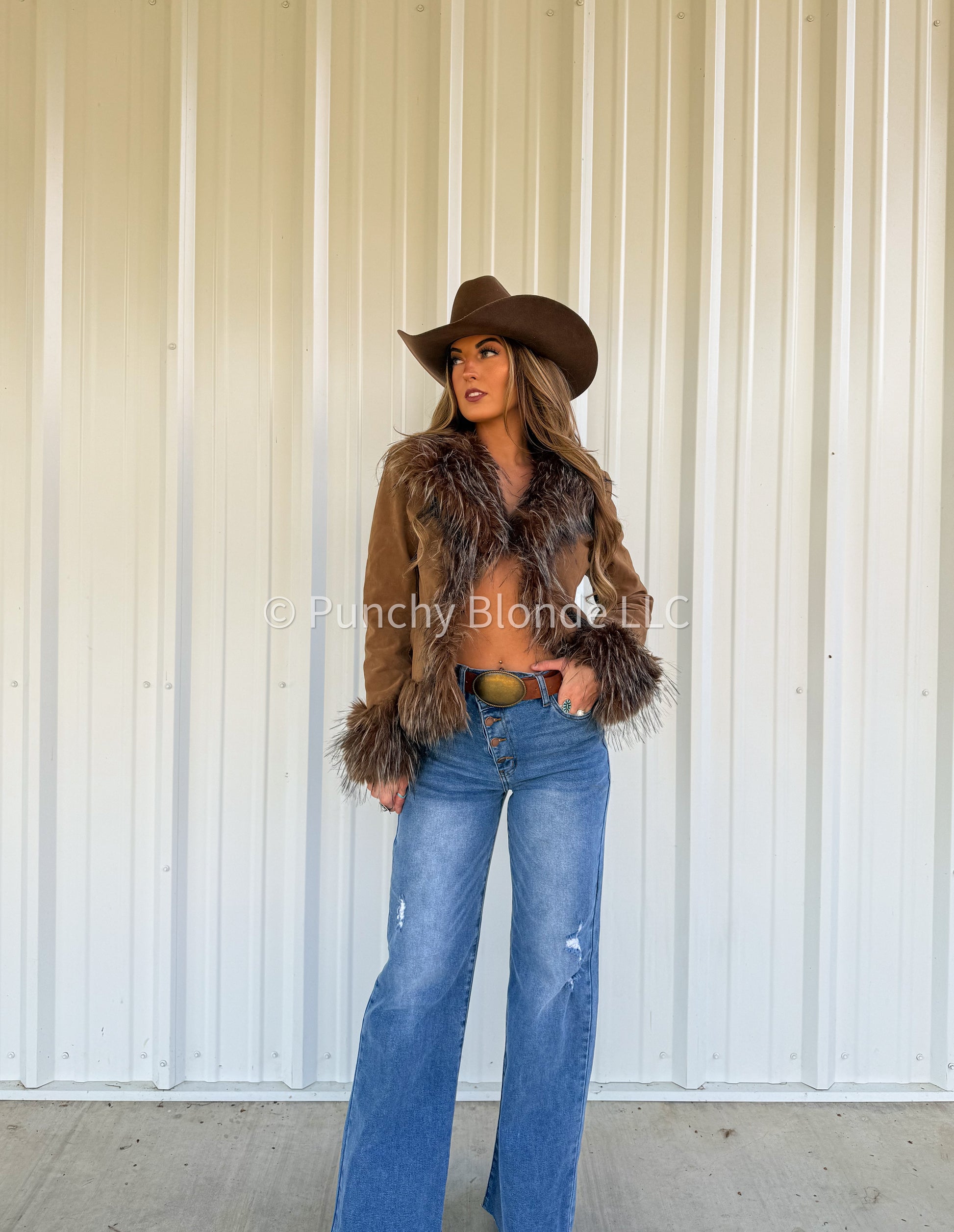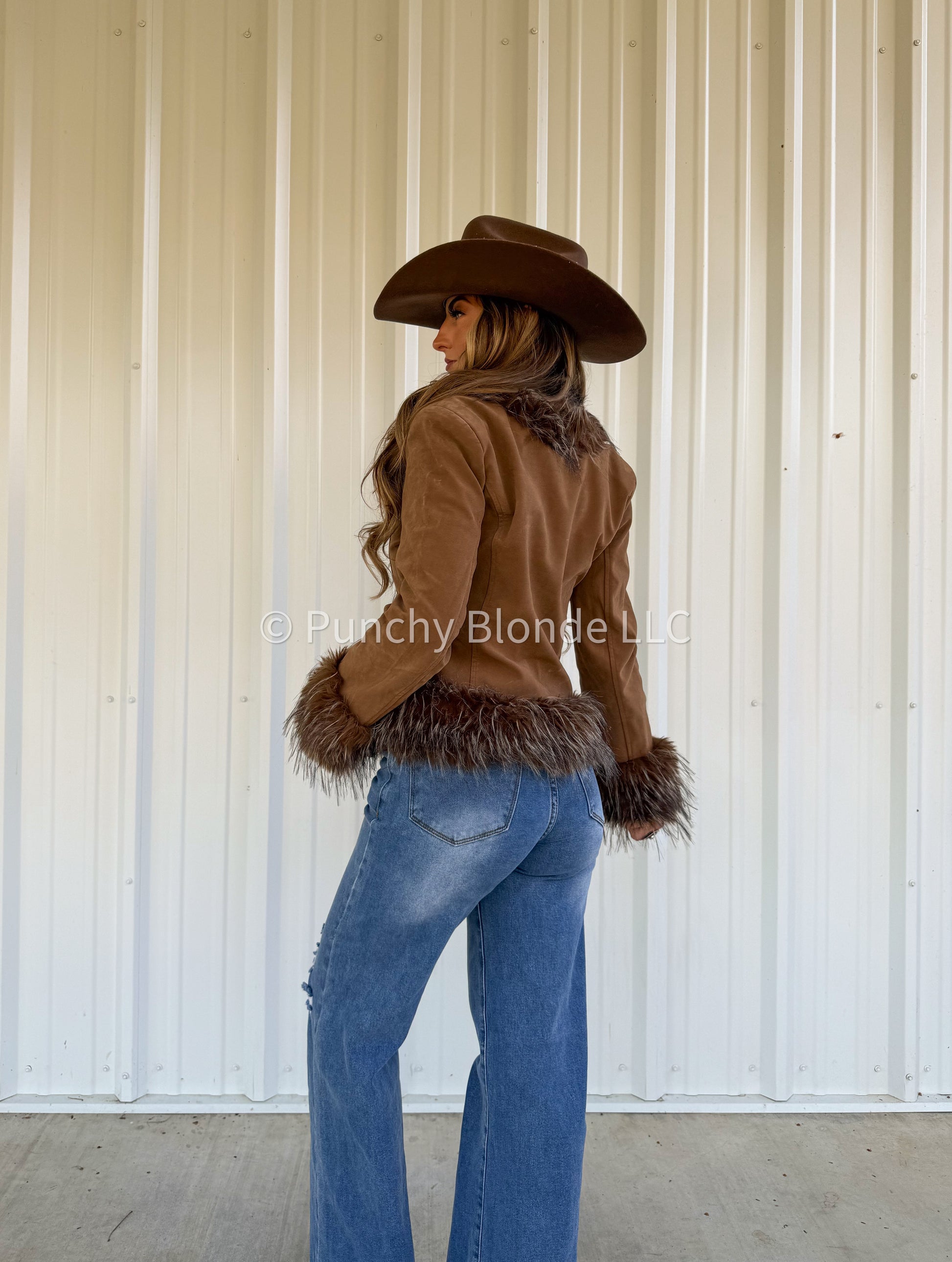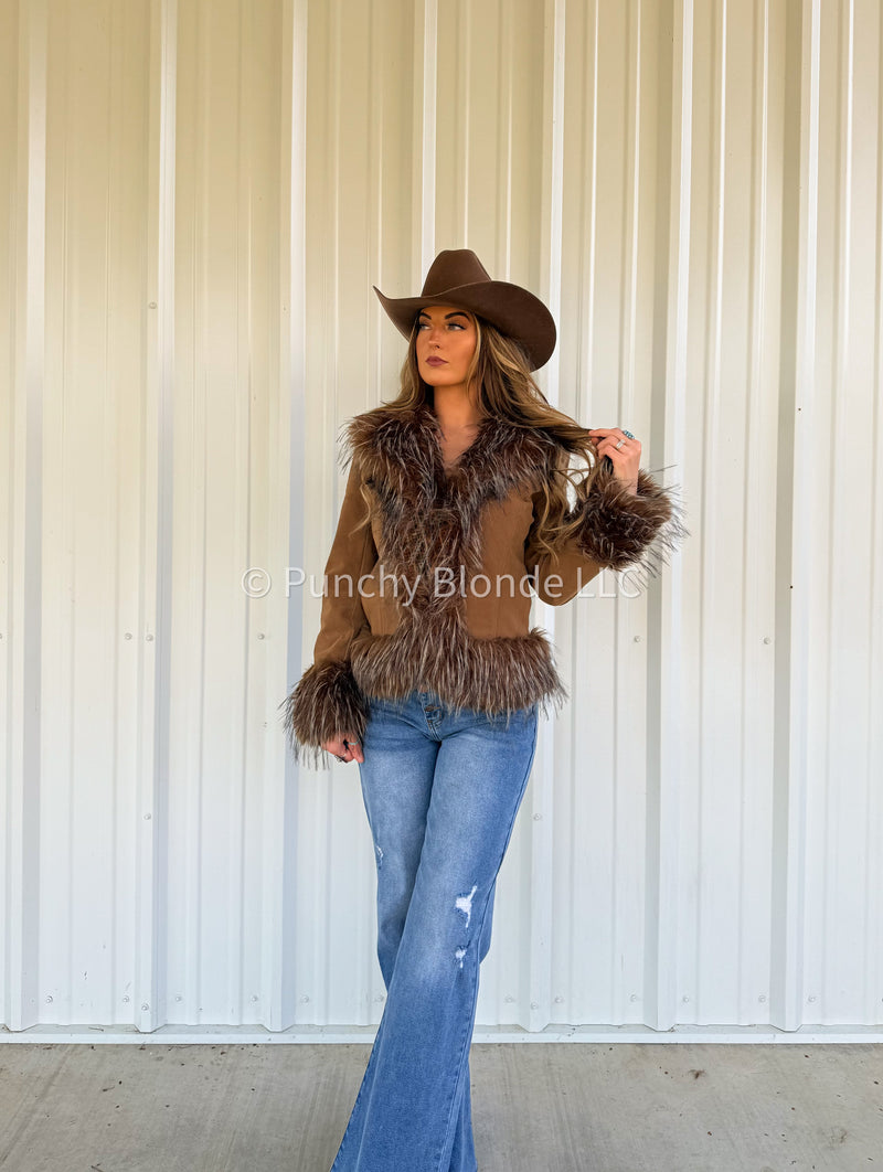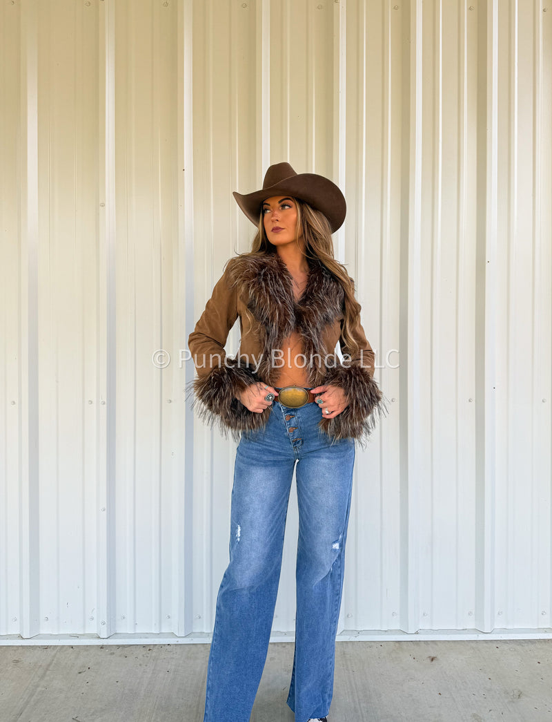Faux fur collar neckline, faux fur cuffs, suede jacket
