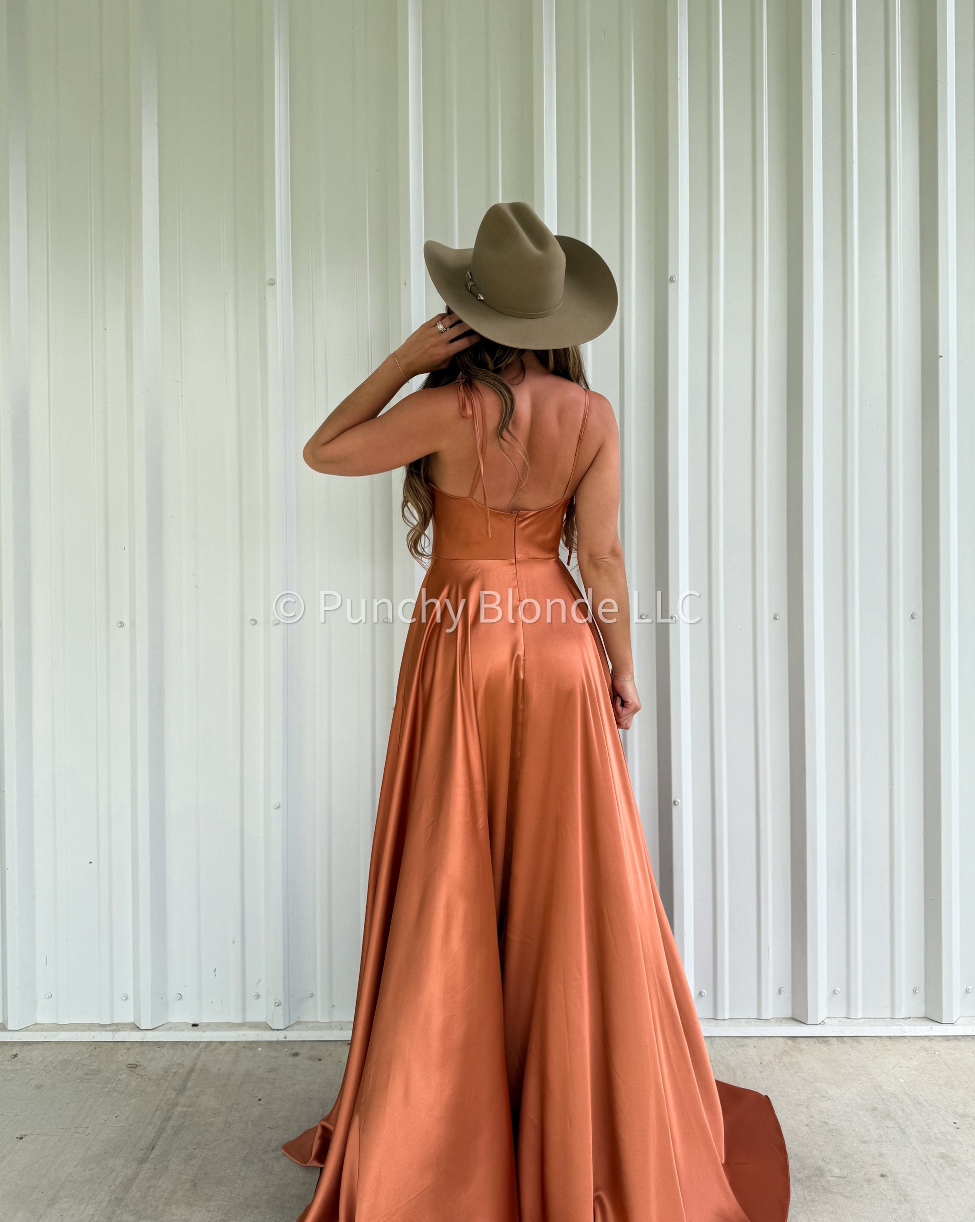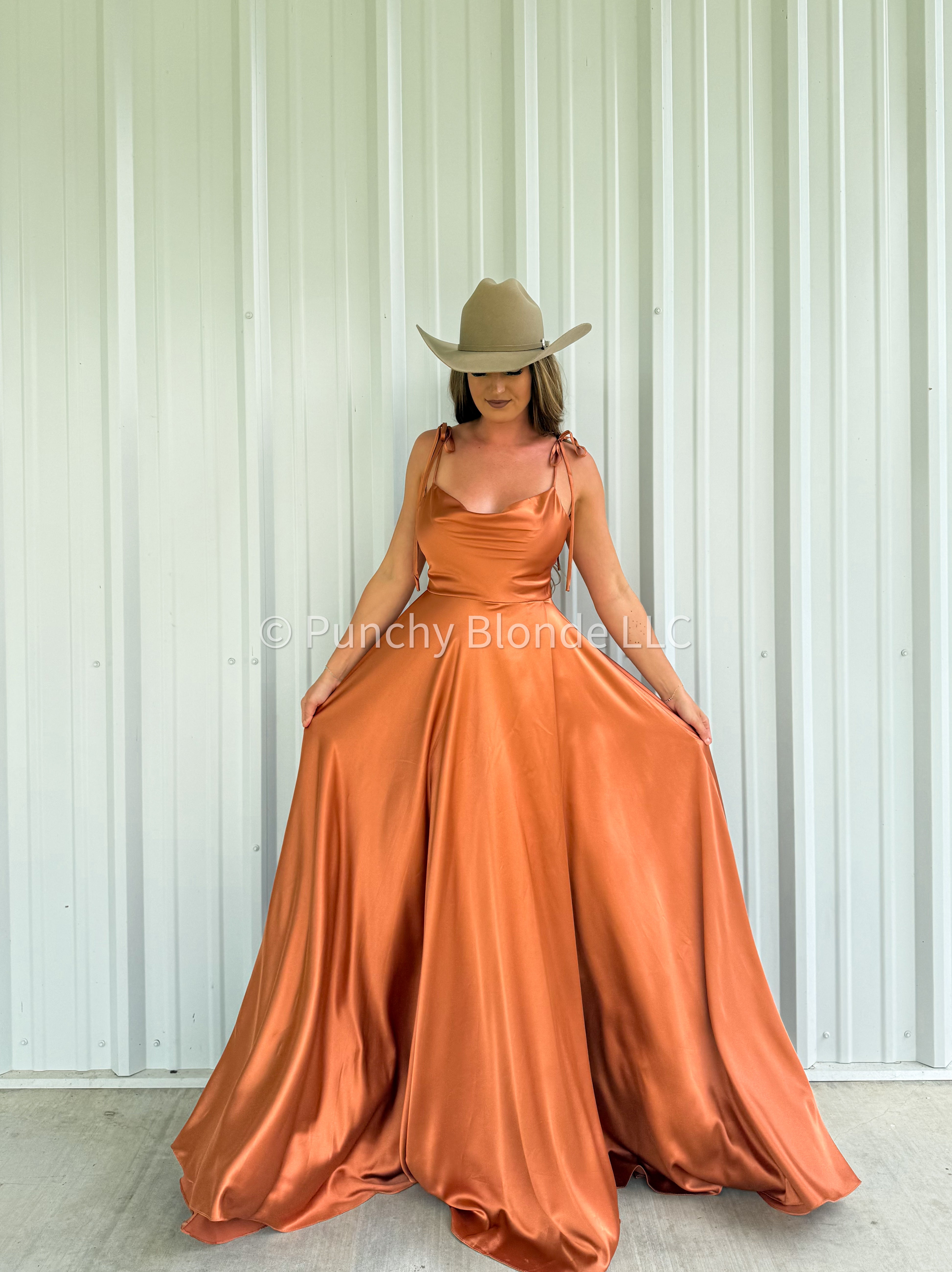 Cowl neckline, adjustable self tie straps, satin material