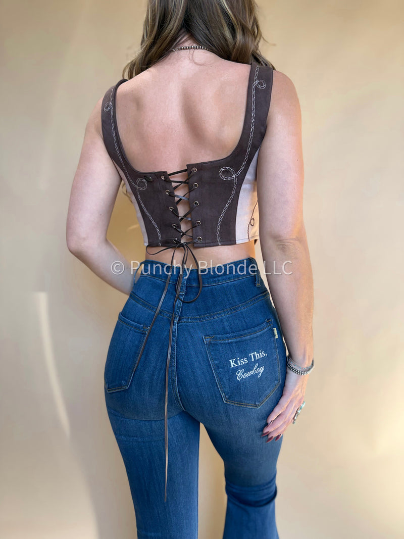 Lace up back, soft suede material, cowboy design