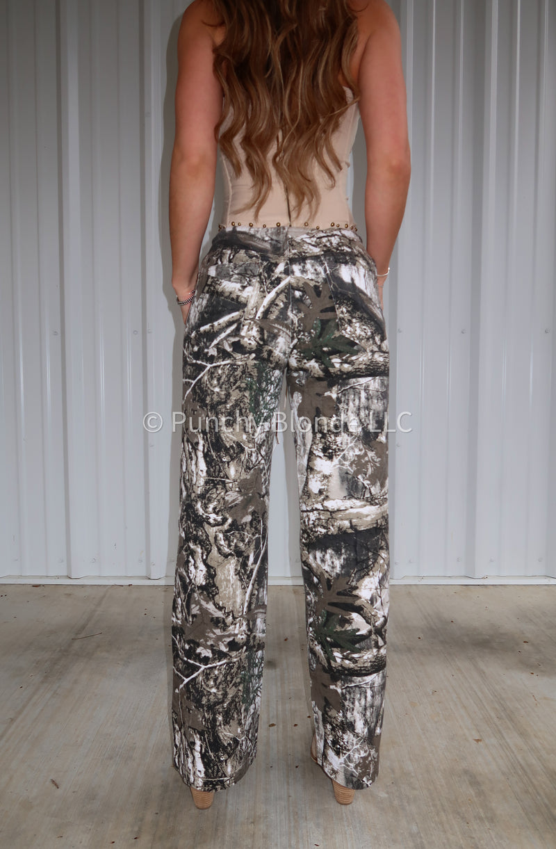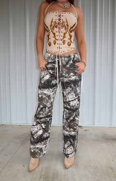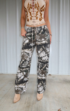 Low rise, wide leg, cow print pants, adjustable drawstring