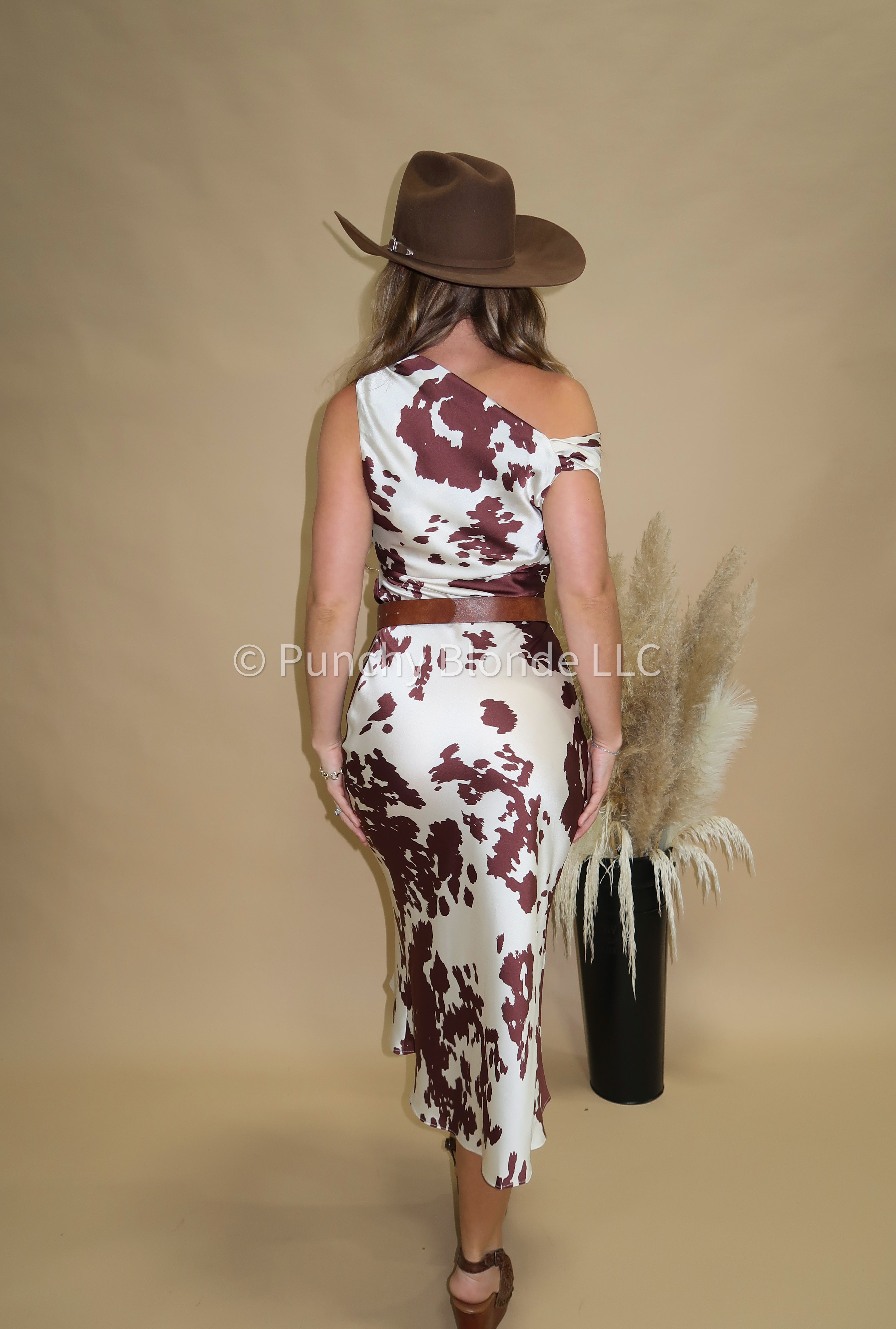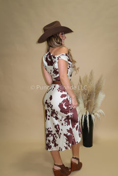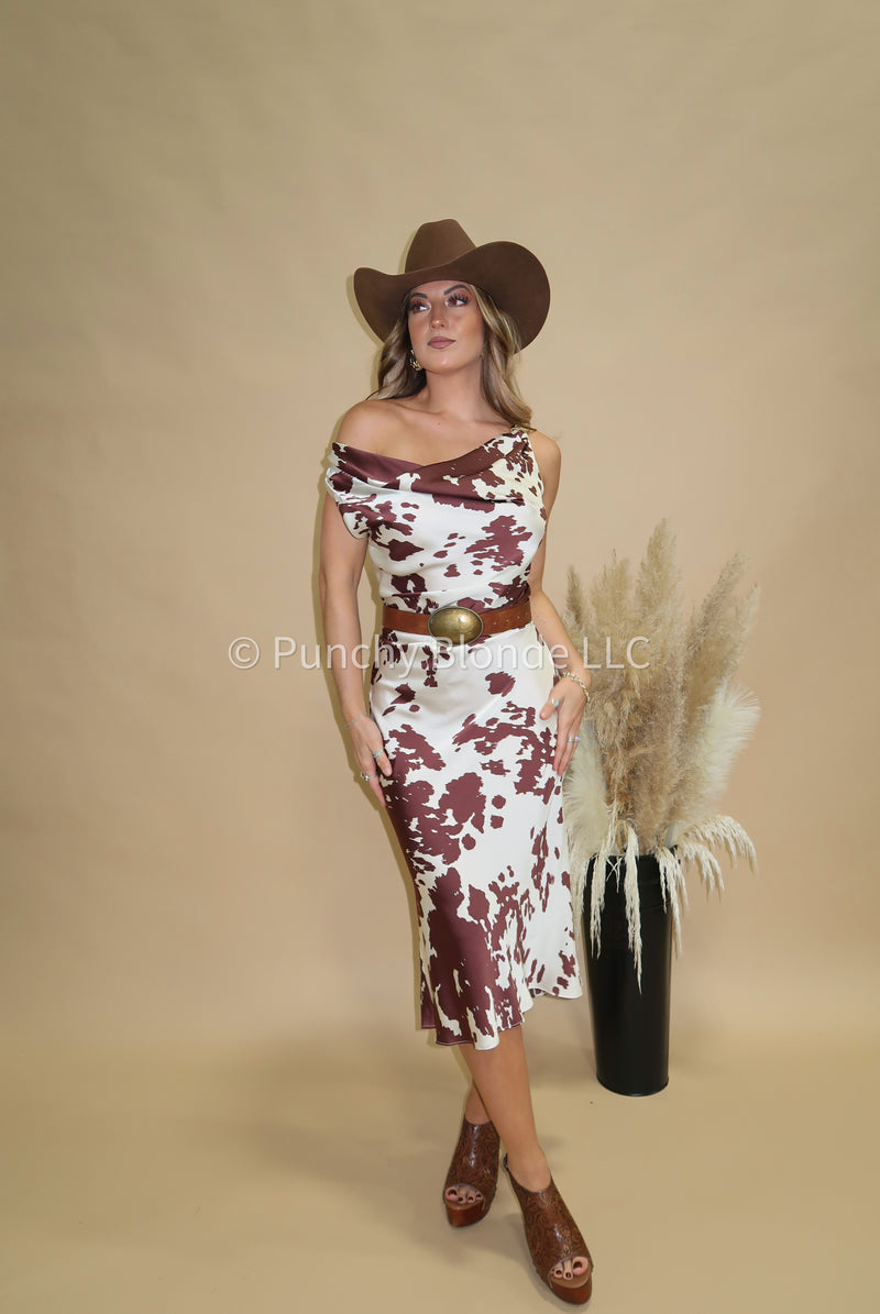 Ruched fabric, satin material, cow print, midi length