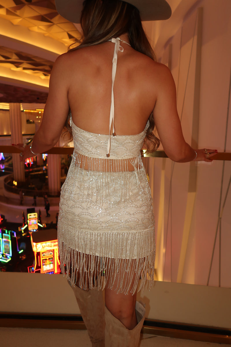 Lined, sequin beaded fabric, beaded fringe detail