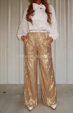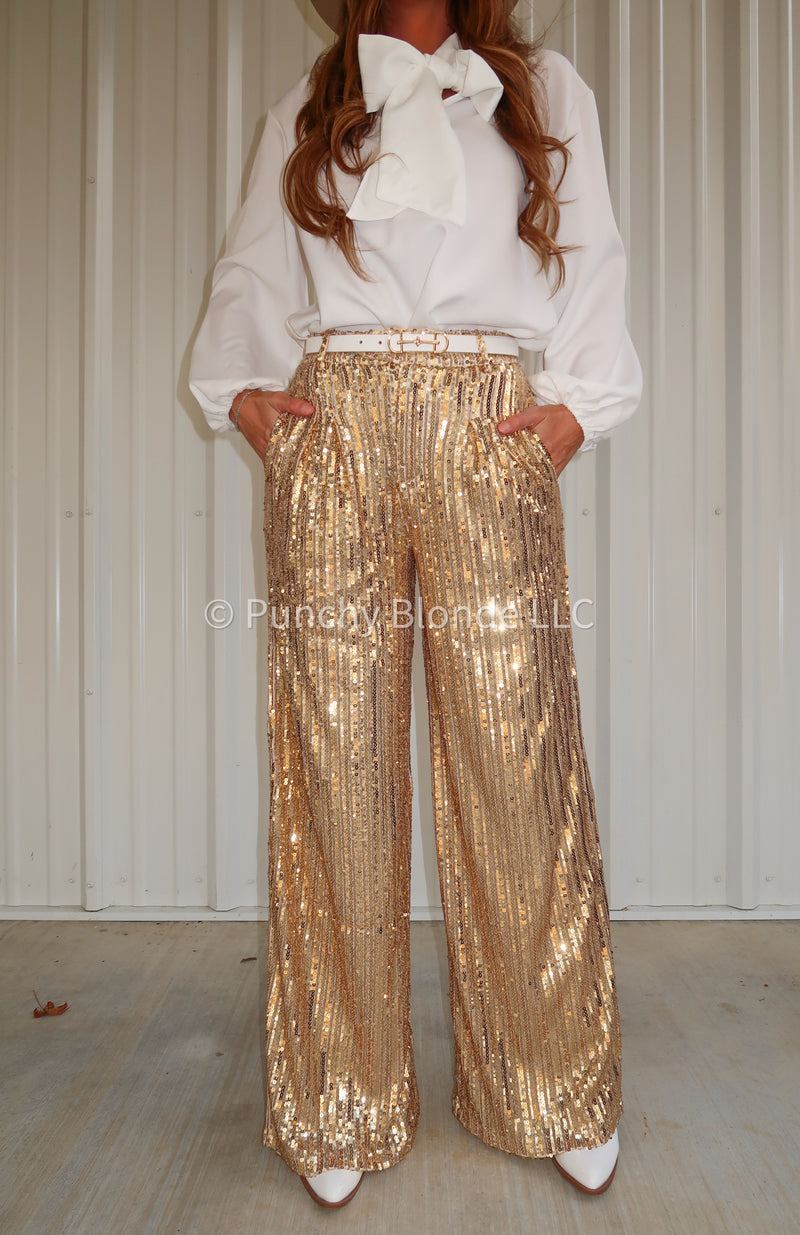 Has belt loops, has pockets, flare pant leg, all over sequin