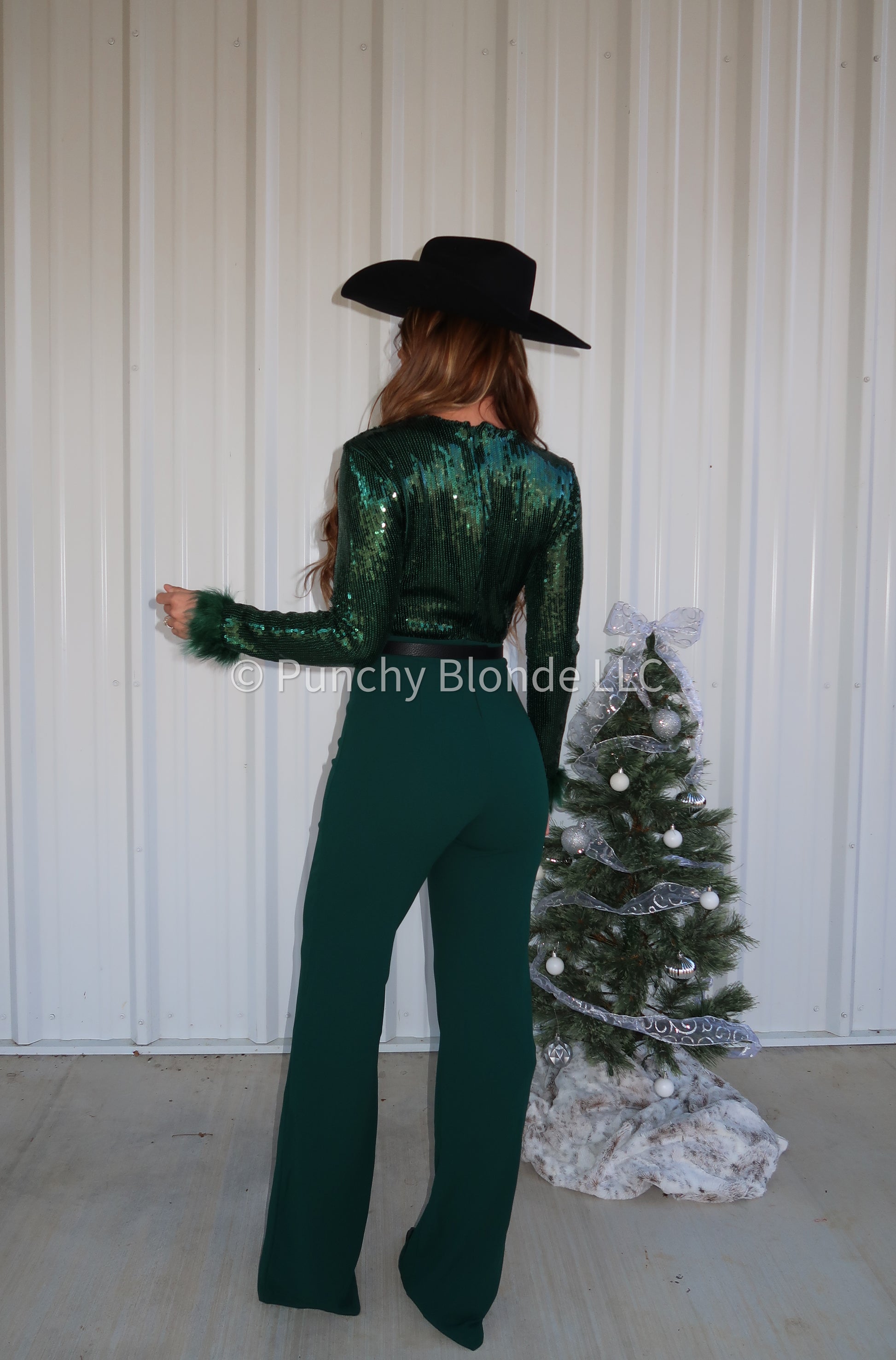 Feather cuff detail, flare pant leg, one piece jumpsuit