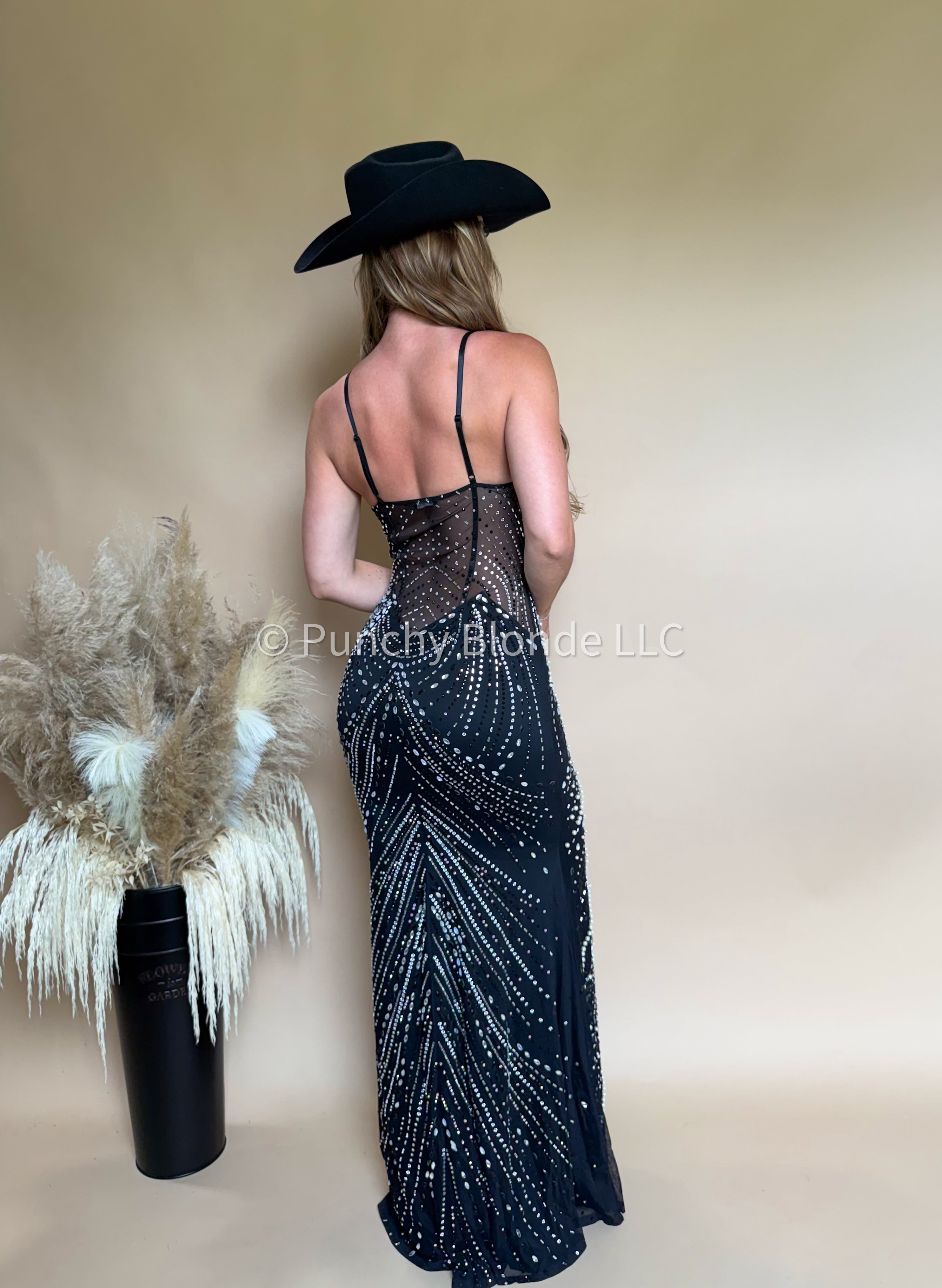 Front slit detail, silver and iridescent rhinestones