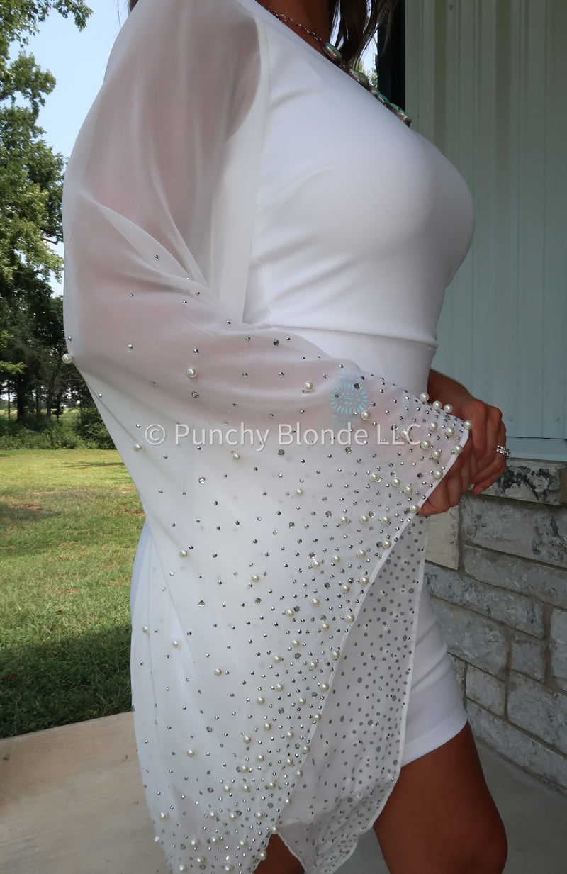 One shoulder, mesh drape sleeve, pearl and rhinestone detail