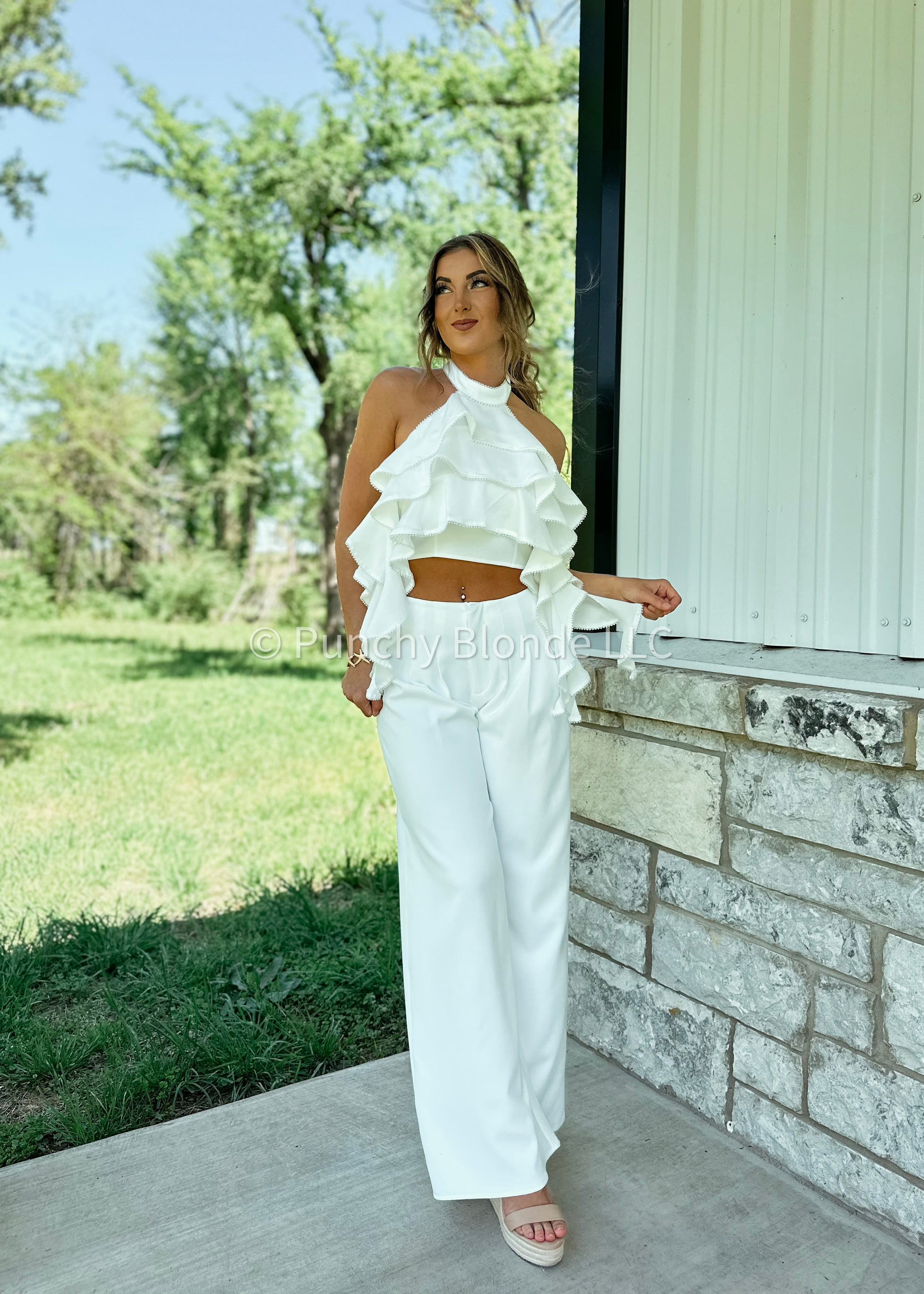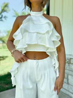 Halter neck, tiered crop top, pearl trim, zipper closure