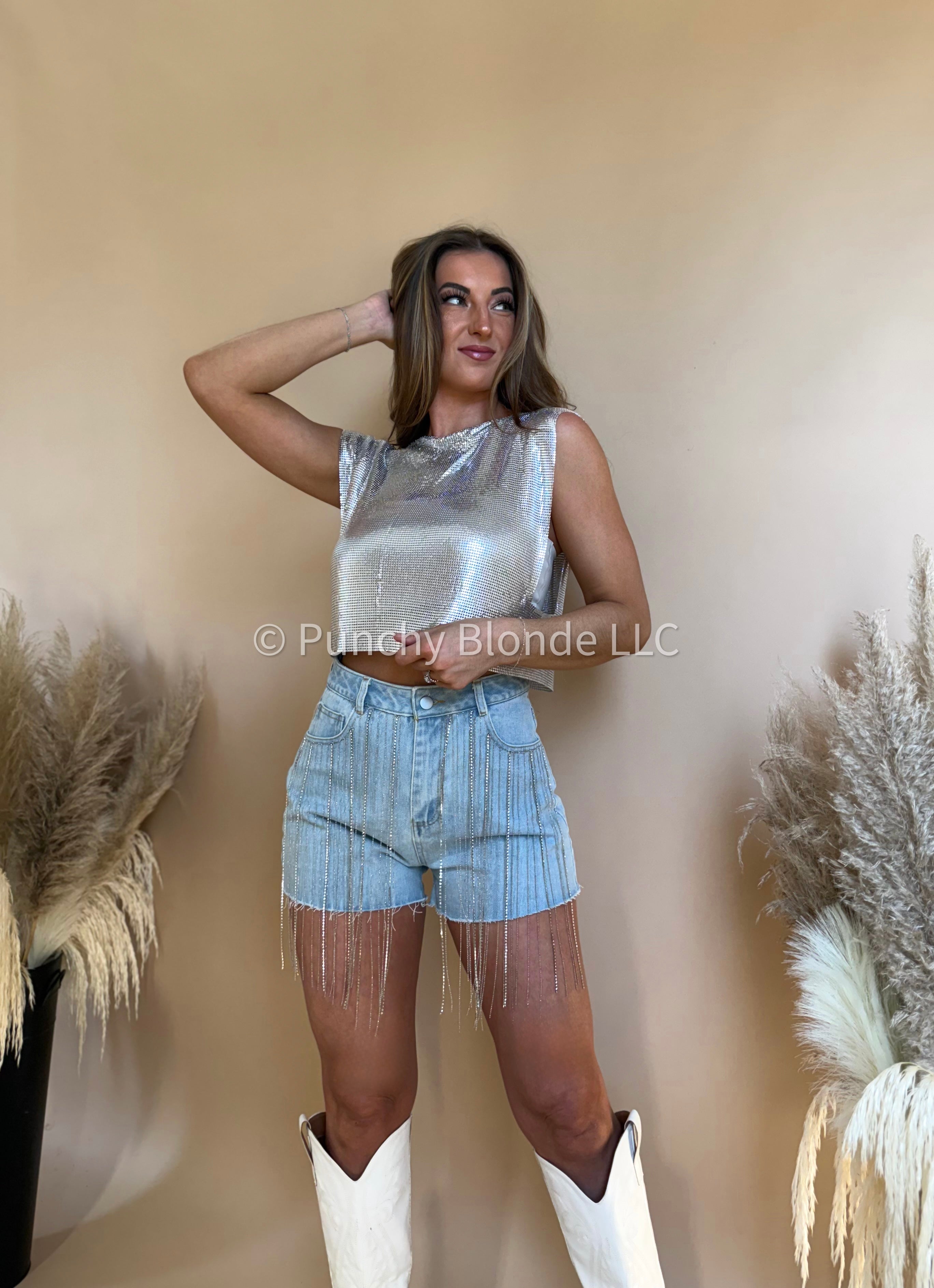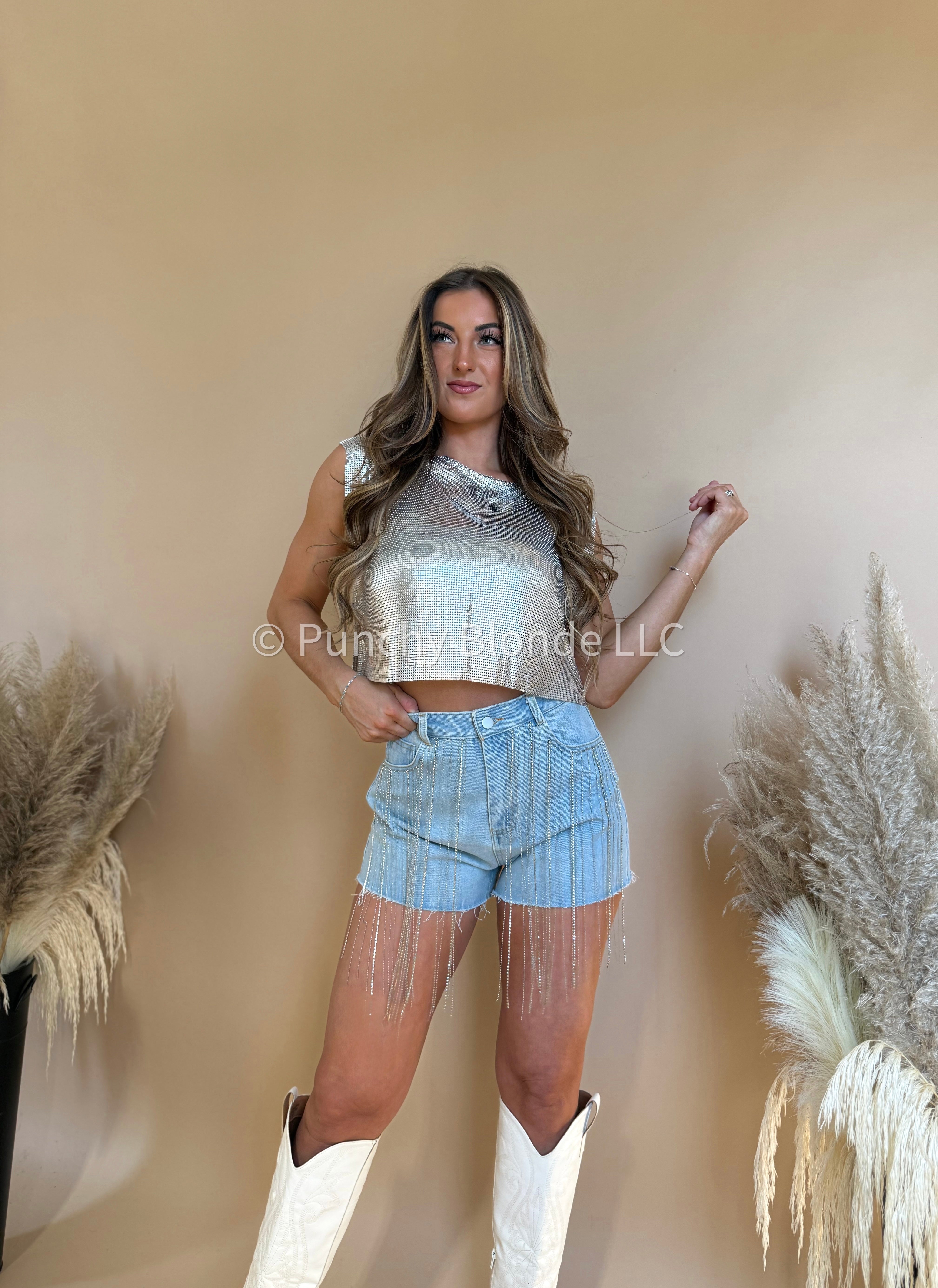 Non stretch, crop top, metallic silver chain link