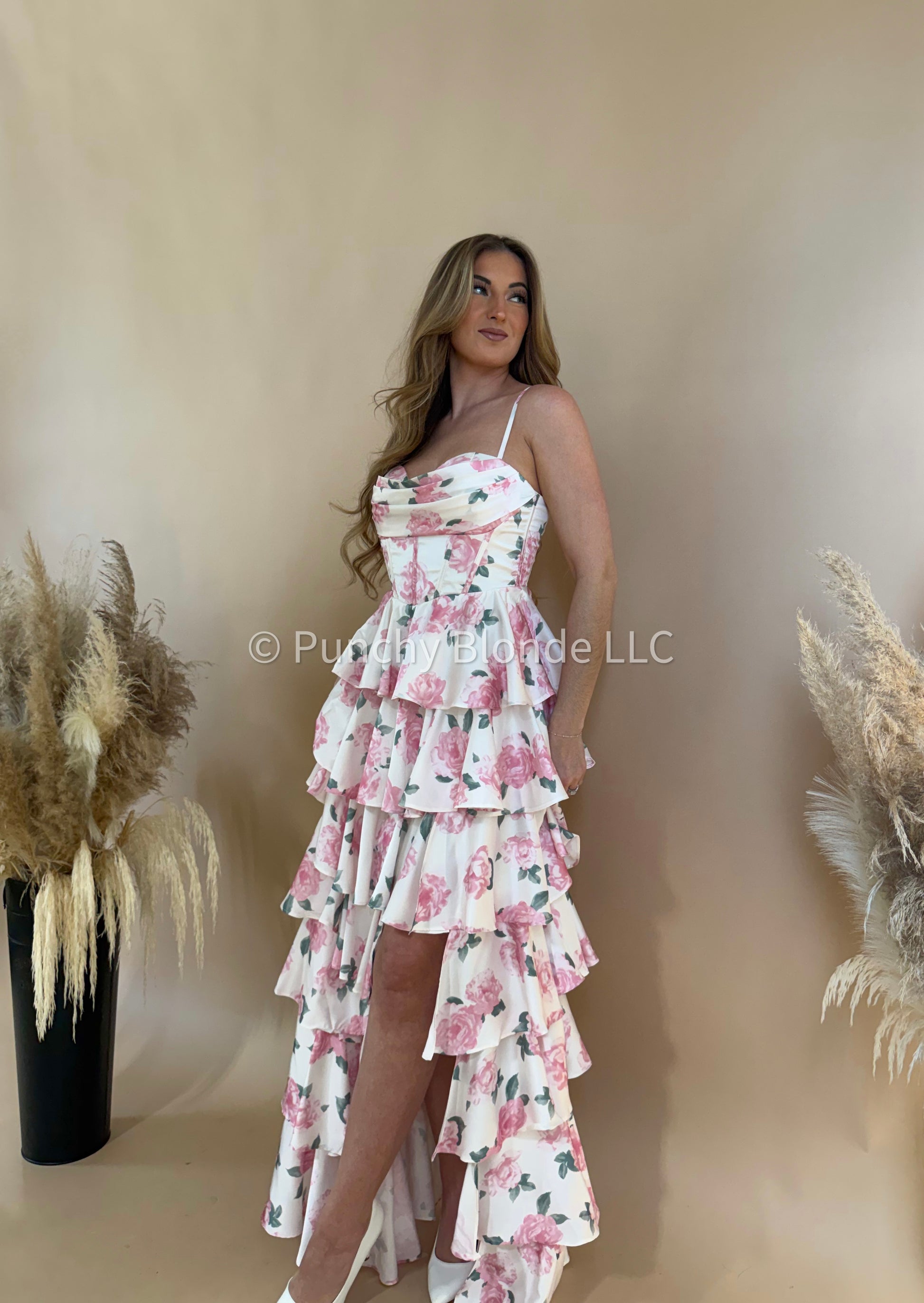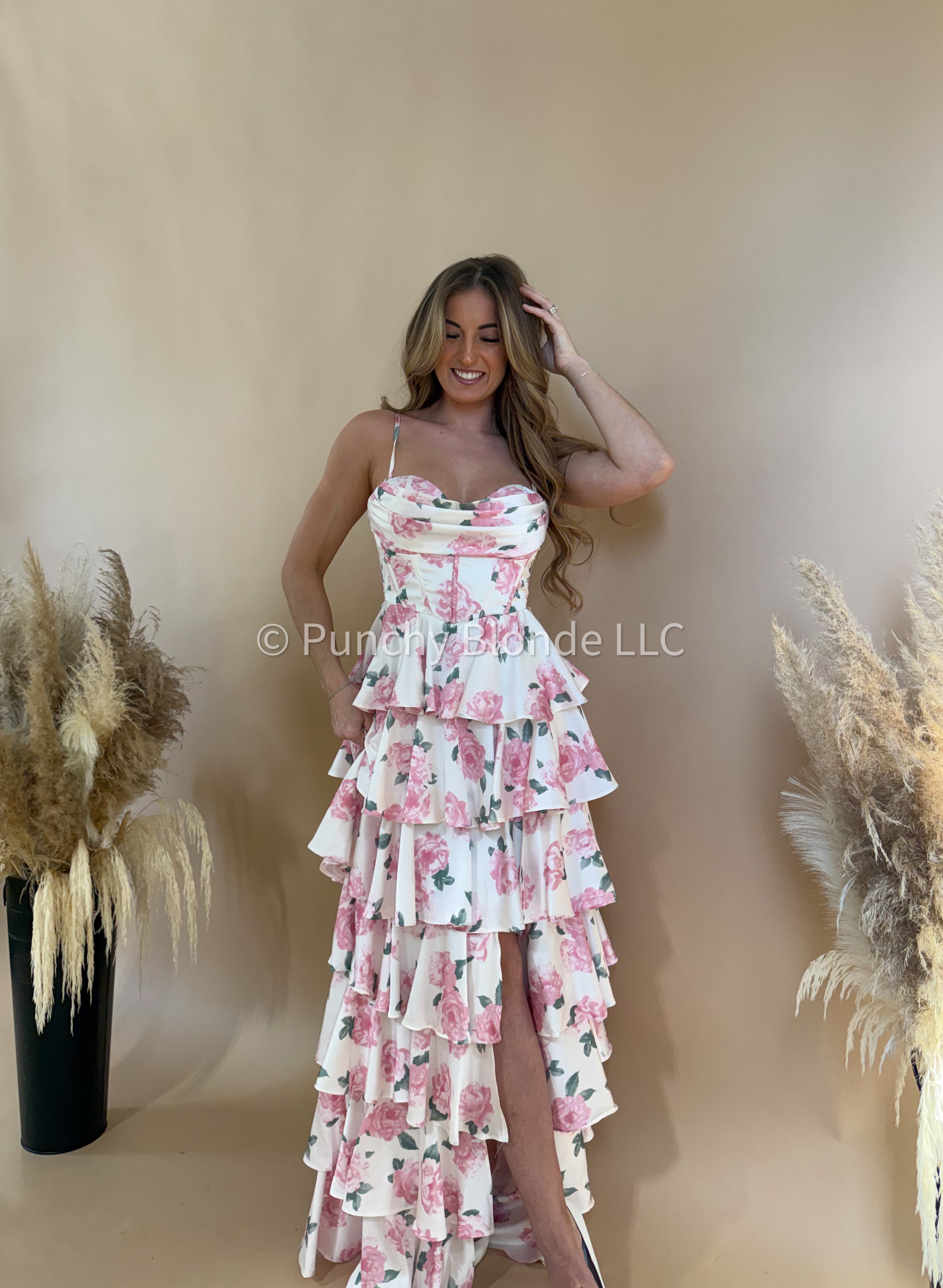 Left leg slit, satin material, tiered maxi dress, floral design