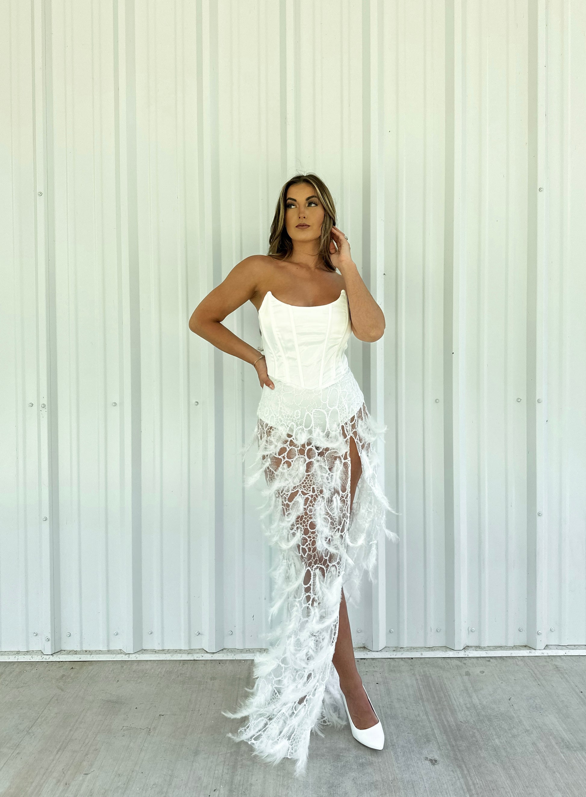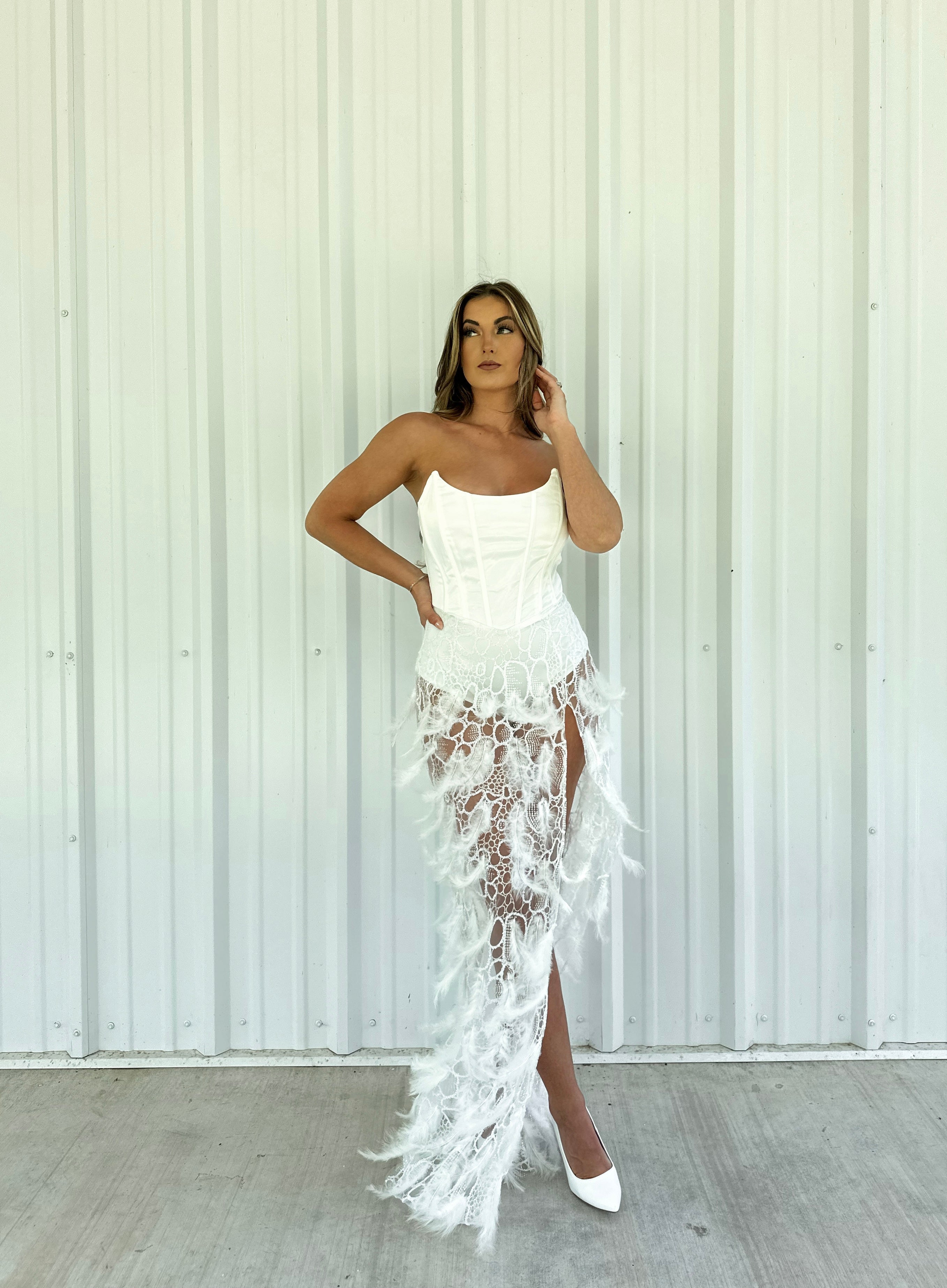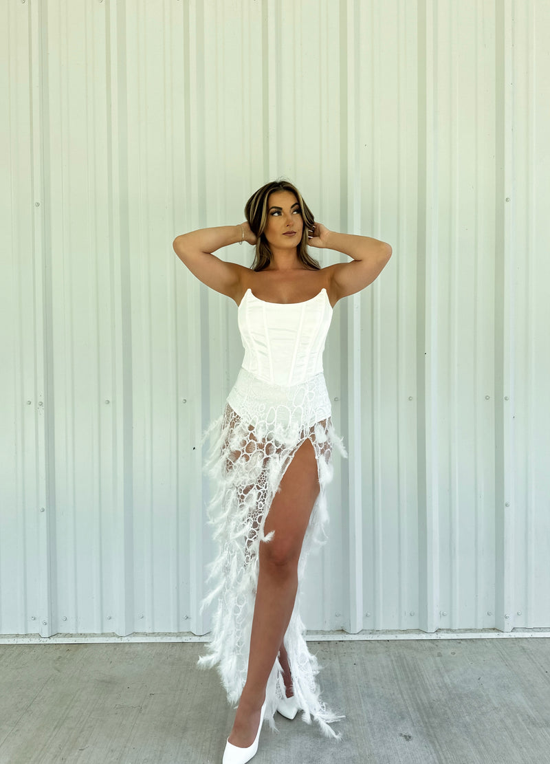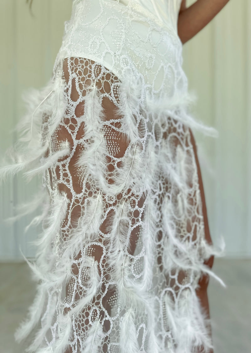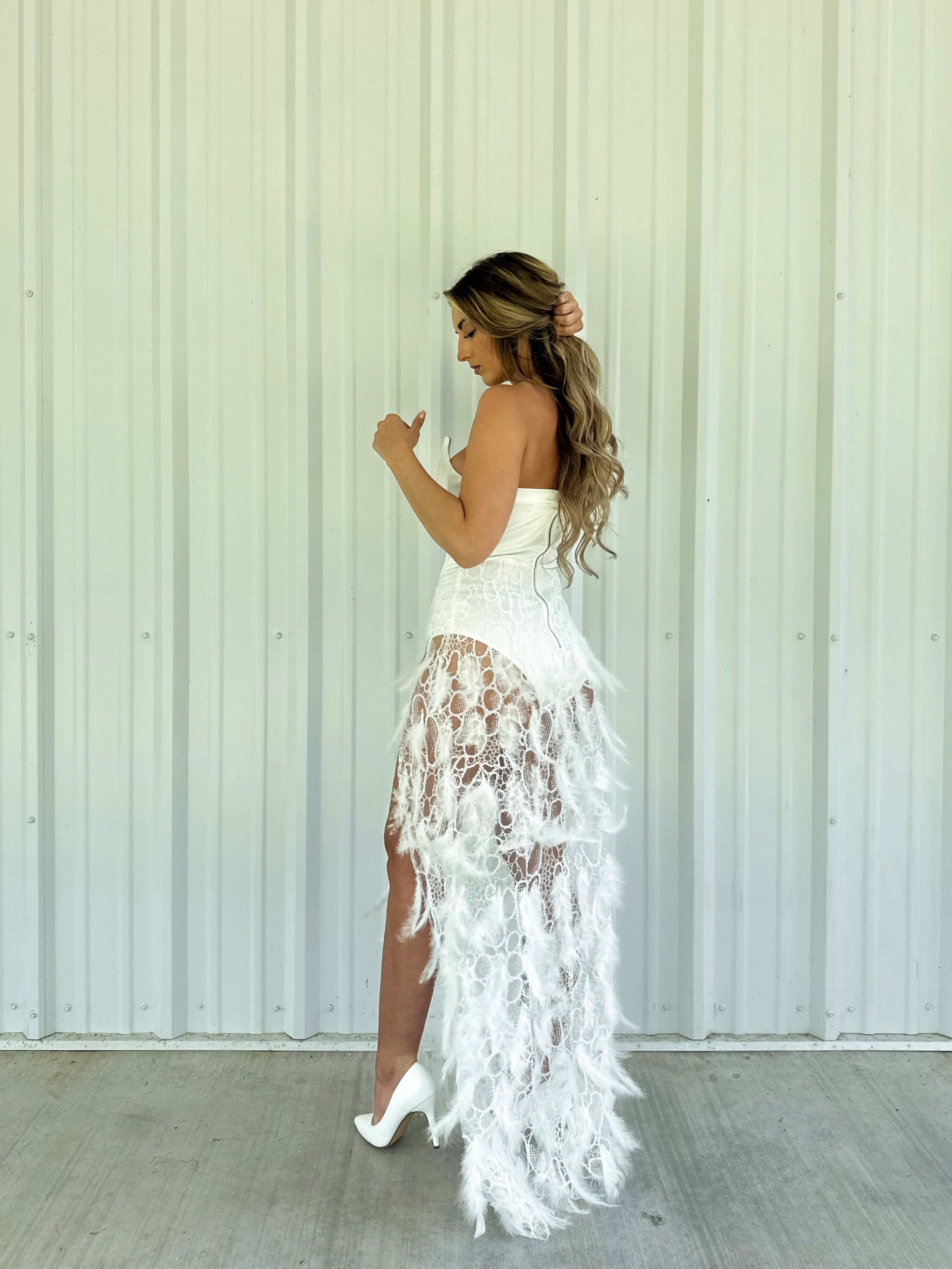 Sheer mesh skirt, thigh high slit, bodysuit button closure